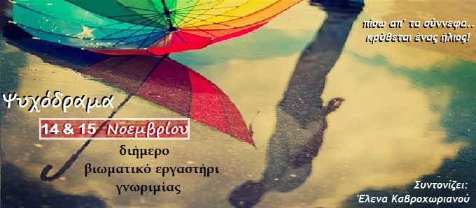 Βιωματικό εργαστήρι ψυχοδράματος: 21-22 Νοεμβρίου Published 19 Οκτωβρίου, 2015 at 680 × 298 in Εργαστήρια γνωριμίας Μου αρέσει! Φόρτωση...