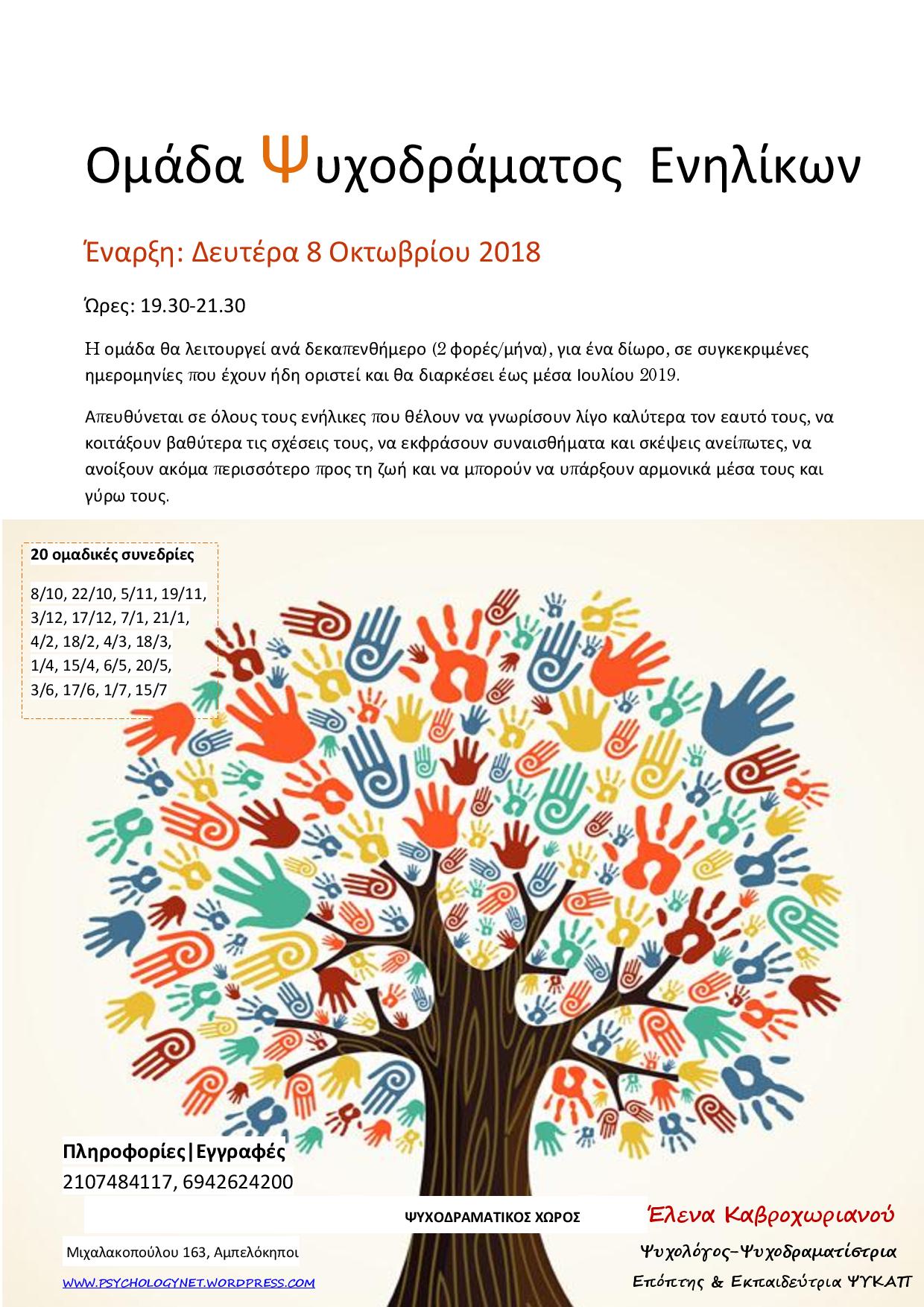 Μετά τις εισαγωγικές συναντήσεις γνωριμίας με την ομαδική μέθοδο του Ψυχοδράματος στις αρχές Οκτωβρίου, ξεκίνησε η απογευματινή ομάδα ενηλίκων, η οποία λειτουργεί ανά 15 ημέρες, Δευτέρα 19.30-21.30 έως αρχές Ιουλίου 2019.